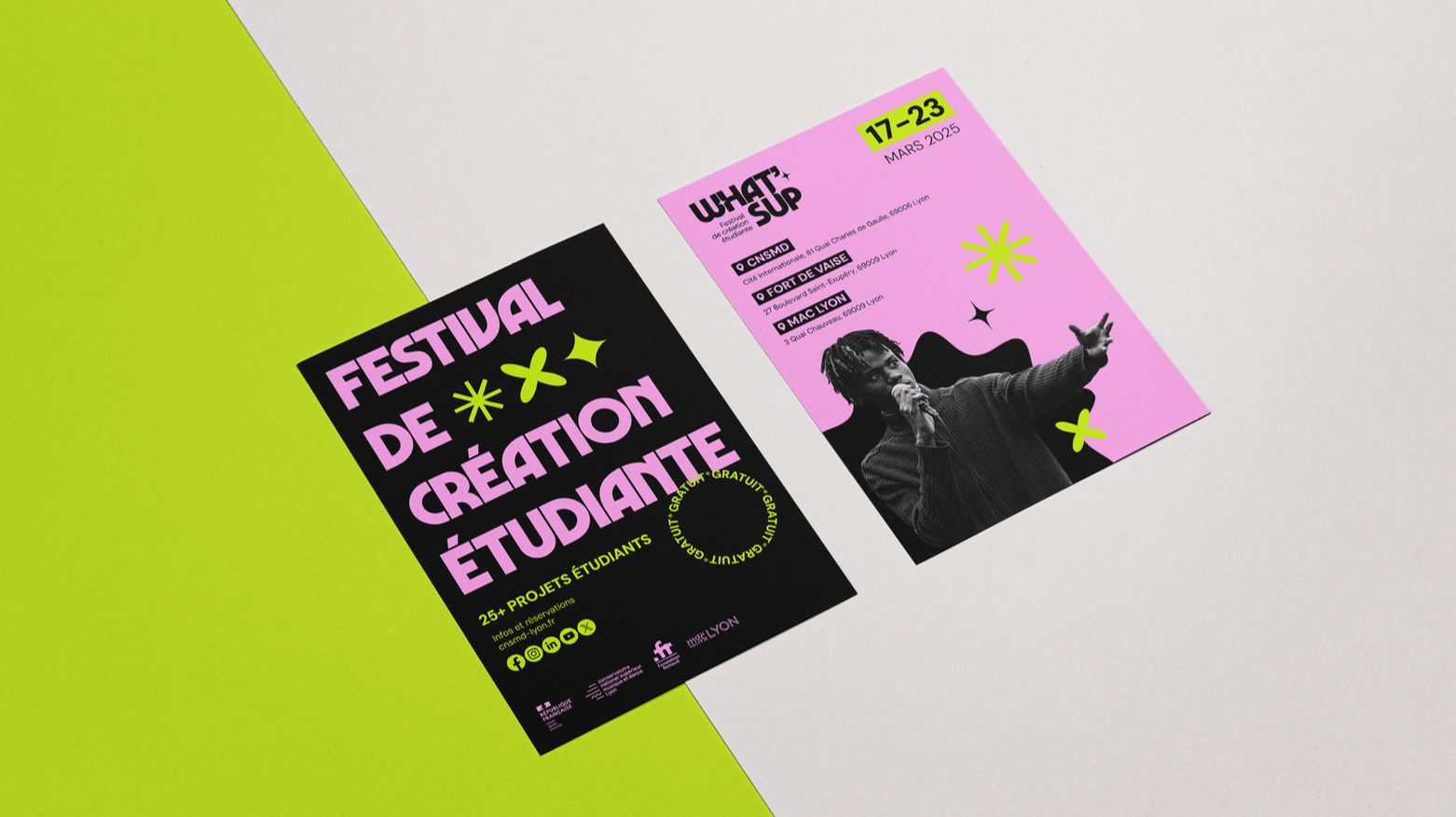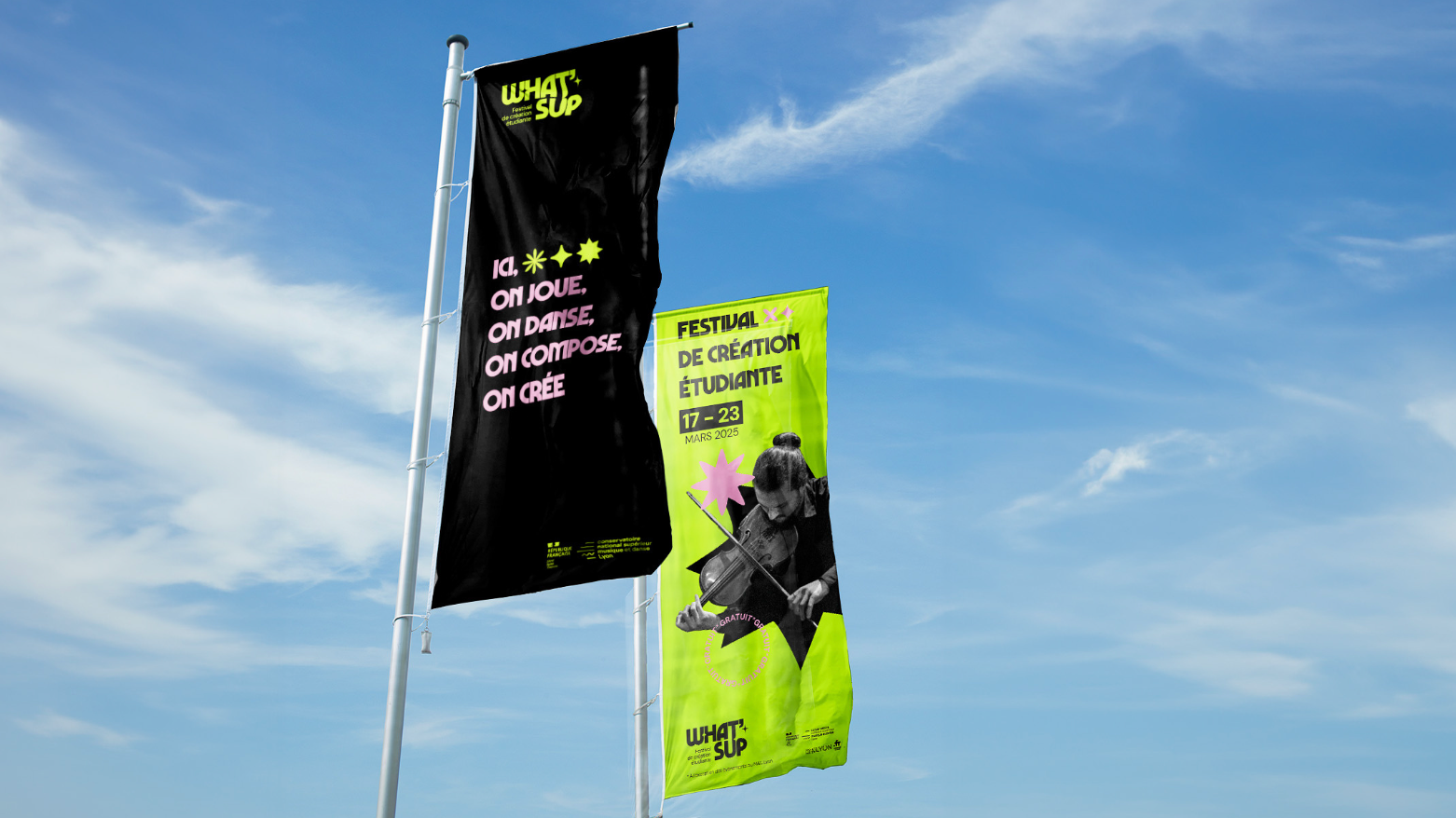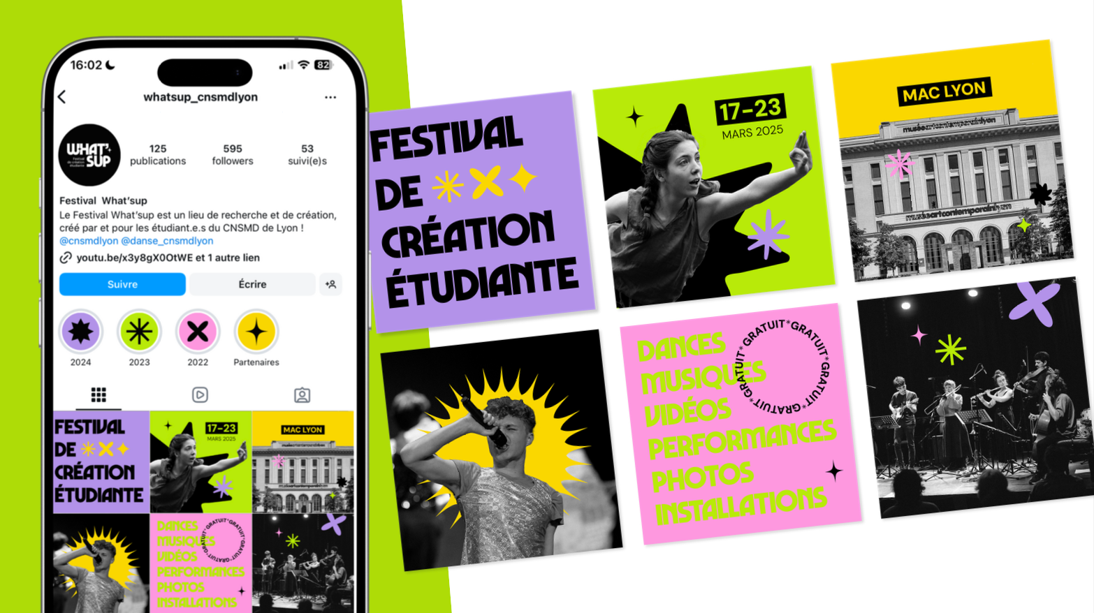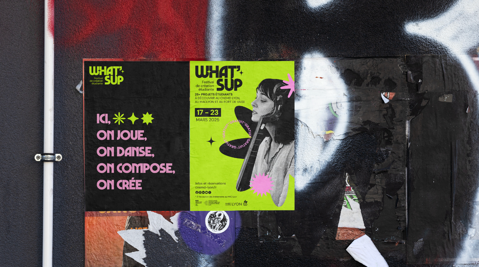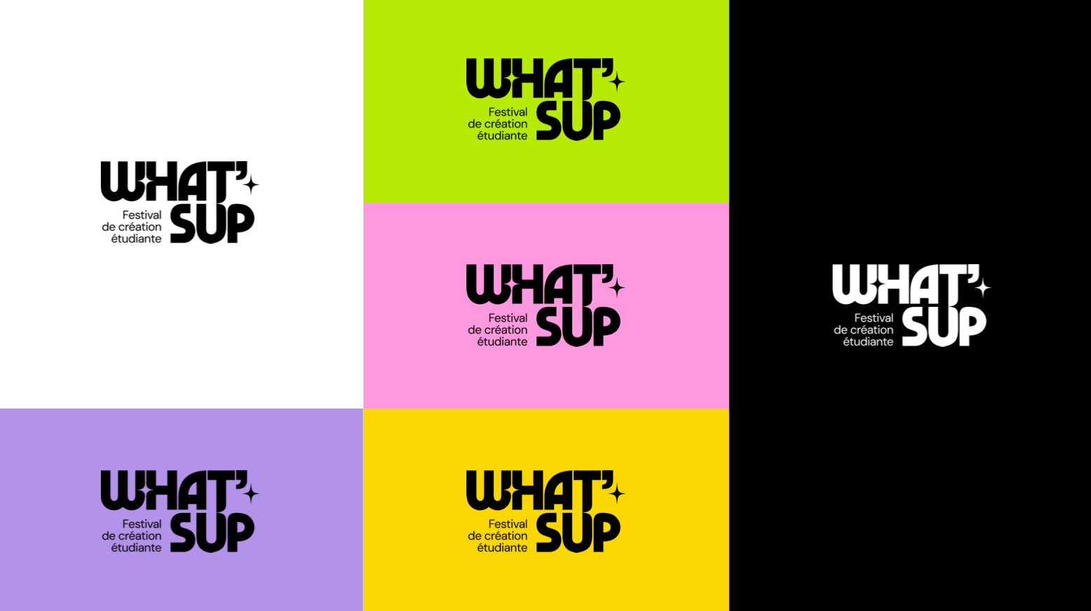 L'identité qui fait du bruit. Un festival étudiant, un logo massif et des couleurs qui vibrent. Un univers graphique qui s'impose et qui ne passe pas inaperçu pour marquer les esprits direct. C’est frais, c’est jeune et ça bouge.
