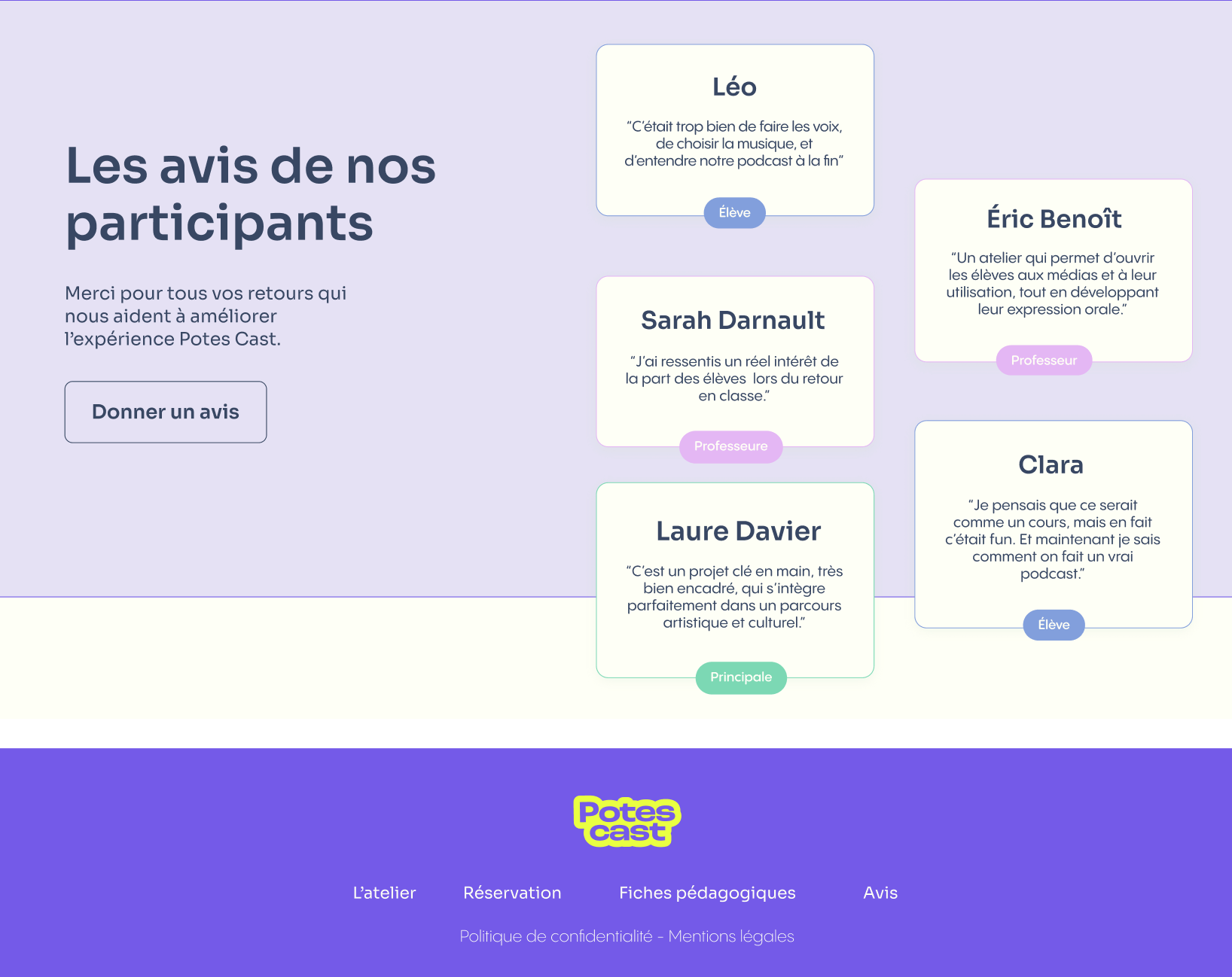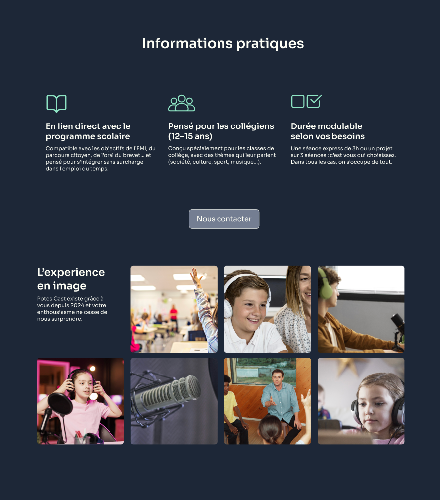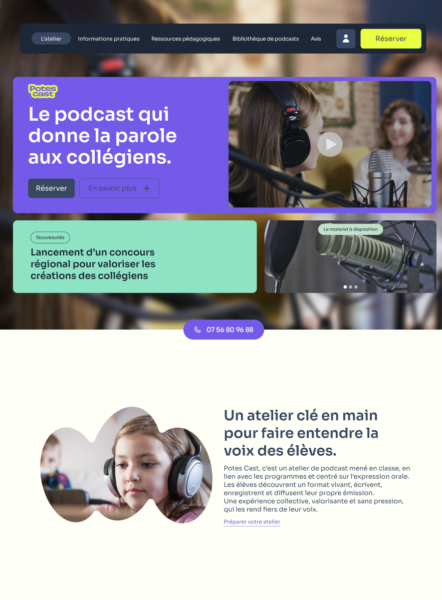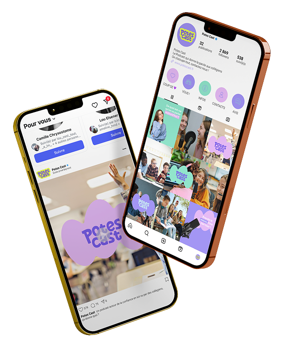 Une identité complète pour Potes Cast, entre webdesign, templates réseaux sociaux et supports pédagogiques. Un univers vibrant construit autour de formes souples et de contrastes forts pour rendre l’expression orale accessible, moderne et coloré. C’est un système graphique global pensé pour engager aussi bien les élèves que les enseignants.